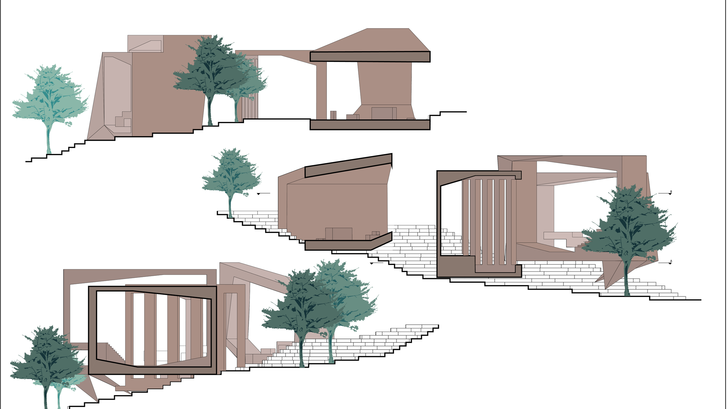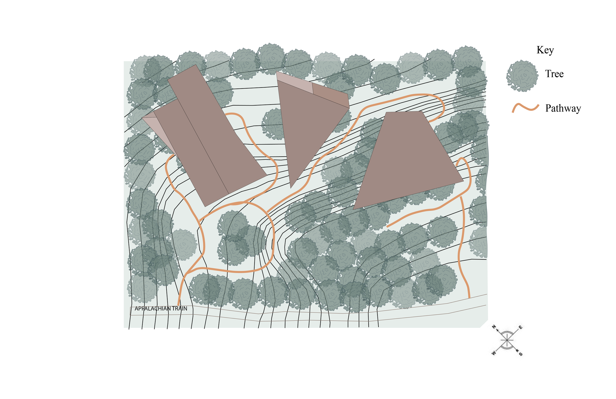 Carved from basic shapes, these clusters of occupiable spaces are designed to let in light from many angles. This gives visitors the feeling of being in nature while also having shelter and a place forest. Each structure is carved to give visitors access to rest and fuel up for the remainder of the hike. It also gives them the chance to take in the surrounding area and enjoy the views from each structure. Each structure is designed to give the visitors a different experience depending on the time of day, year and the change in weather.